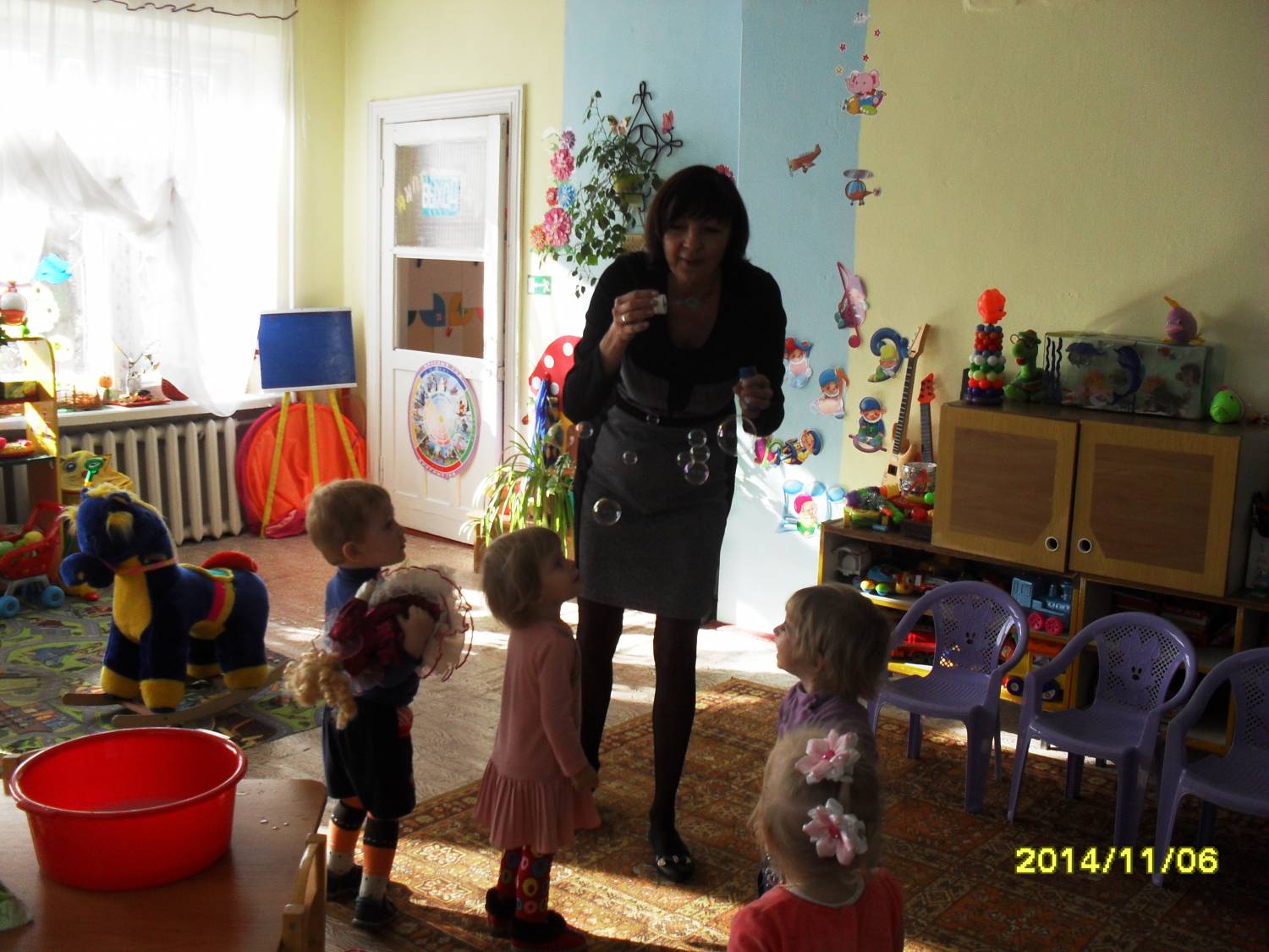 В первой младшей группе прошло занятие по сенсорному воспитанию с элементами экспериментирования на тему: "Водичка, водичка...". Воспитатель Деркачева И.П. в начале занятия использовала сюрпризный момент, чтобы организовать детей. Дети и воспитатель отправляются в путешествие на поиски мыльных пузырей для куклы Кати. Проводится игра "Раскрасим водичку".